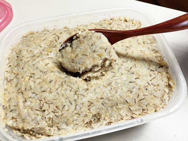 - 前日に蒸して塩をまぶした大豆を、麦と合わせこねる。